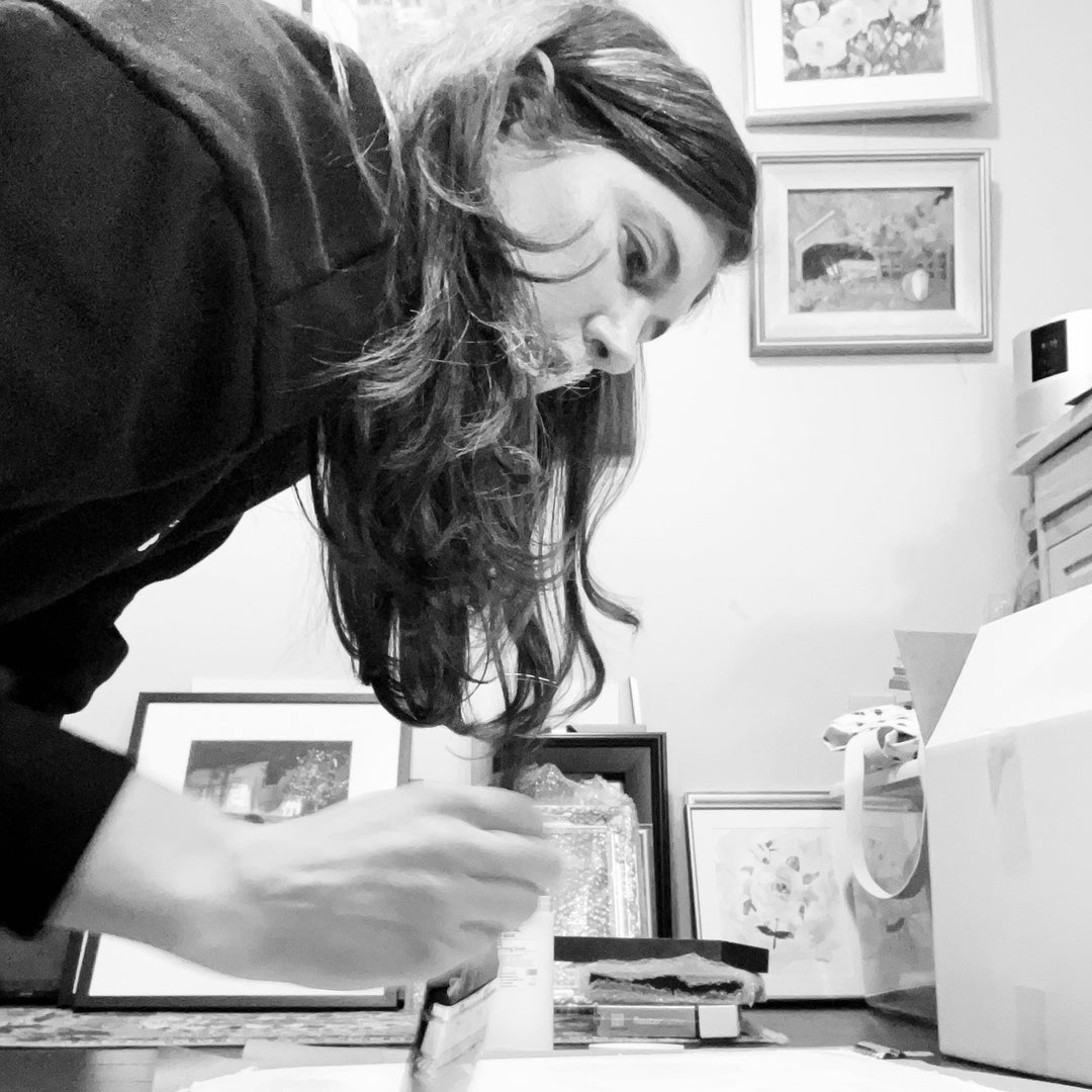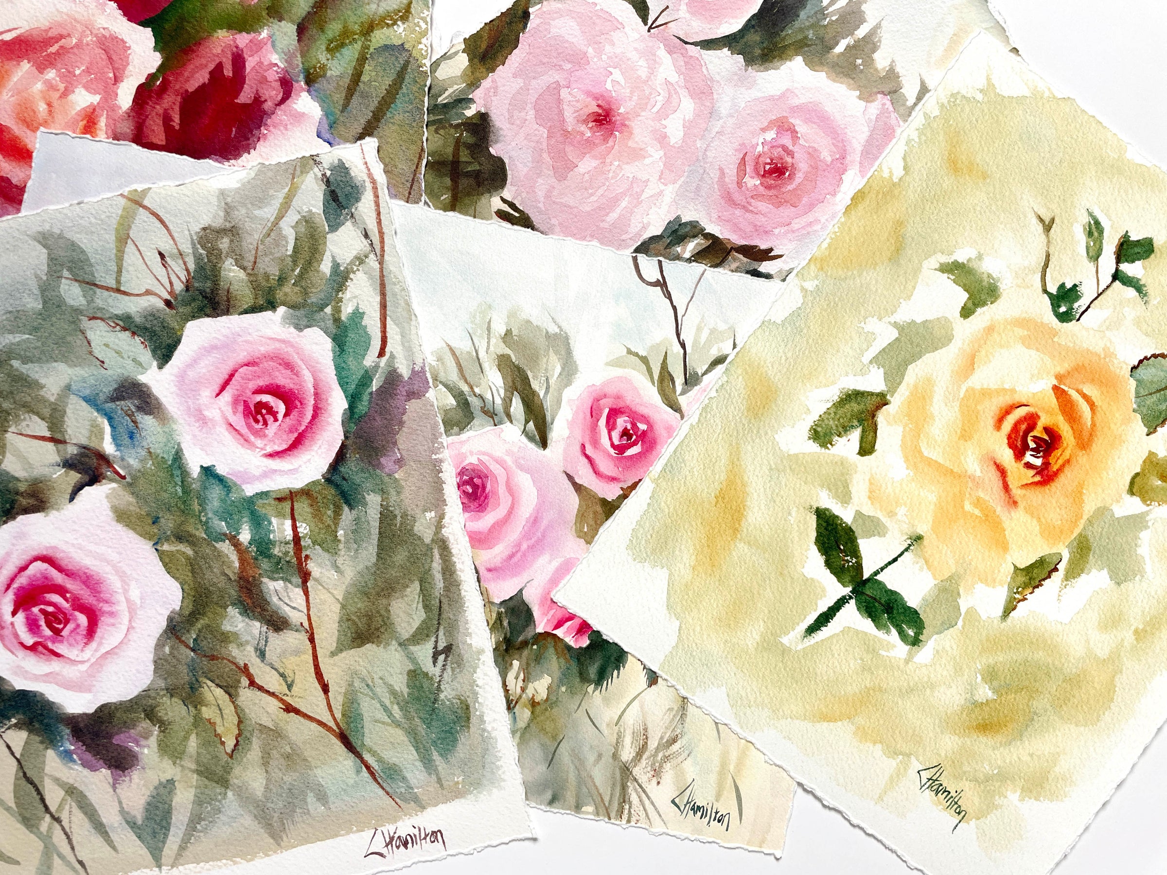 Each piece of art begins with a flower in the garden, a bird in the backyard, or boats in the harbor near Lucinda's home in New England